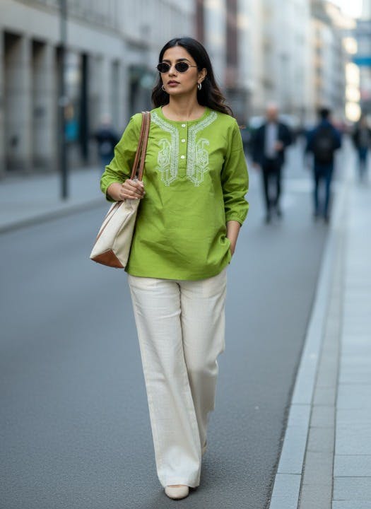 A soothing sage cotton kurta shirt featuring intricate embroidery around the collar, adding a touch of artisanal charm. Pair it with beige pants and silver jewelry to achieve a relaxed boho-inspired look that blends comfort with effortless style.